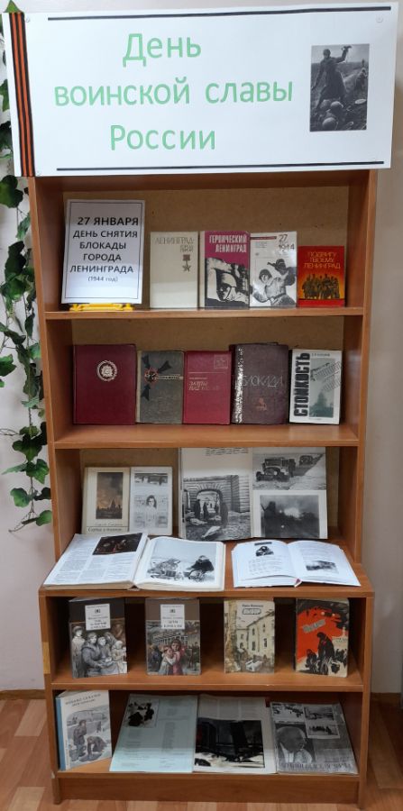Книги на выставке в городской библиотеке № 1 «День воинской славы России» рассказывают о беспримерном подвиге осажденного фашистами Ленинграда, о мужестве и героизме его жителей, сумевших выстоять в нечеловеческих условиях блокады, переживших страшный голод, страдания, смерть близких.