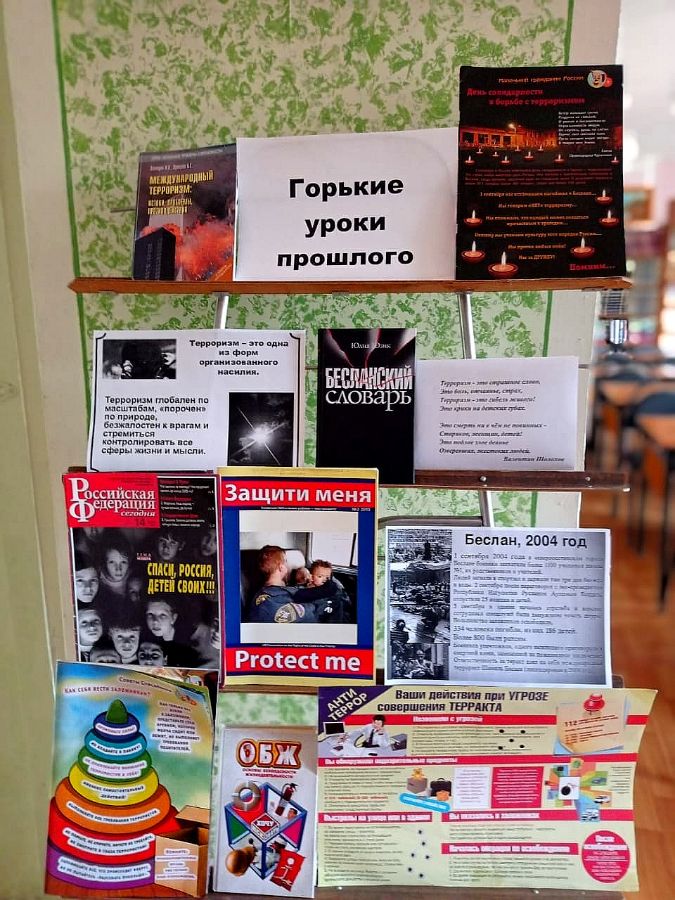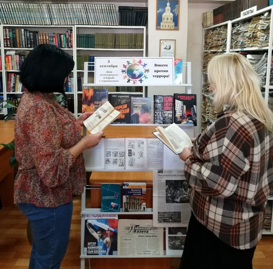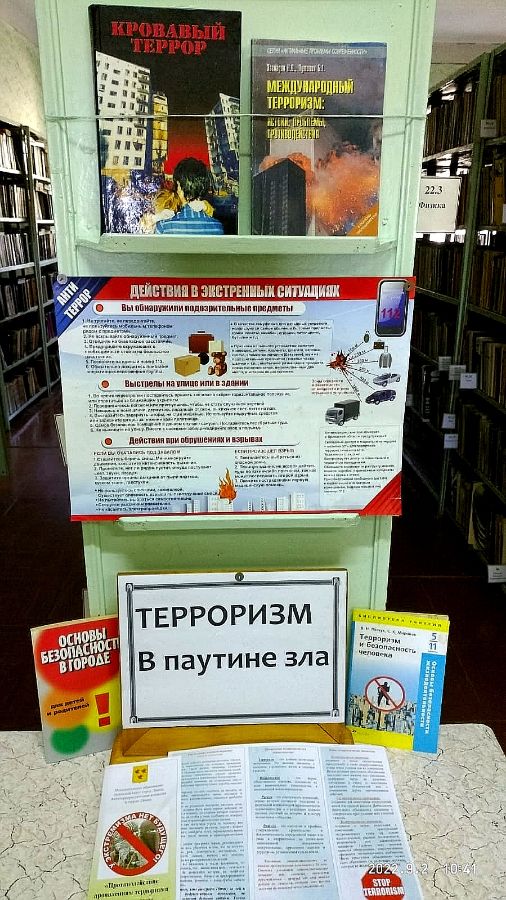 В библиотеках города оформлены книжные выставки, цель которых - показать посредством фото-информационных изданий масштаб угрозы безопасности человечества в современном мире, хронику событий и меры борьбы с терроризмом.